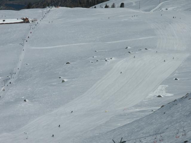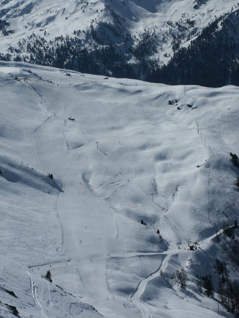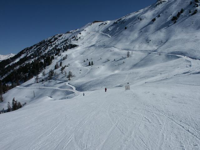 Die Piste Chottes ist eine sehr breite Piste, die zum carven einläd. Sie ist in weiten Teilen nicht sehr steil, hängt aber am Ende in Fahrtrichtung relativ stark zur Seite weg. Für fortgeschrittene Anfänger sollte sie aber kein wirkliches Problem darstellen. |