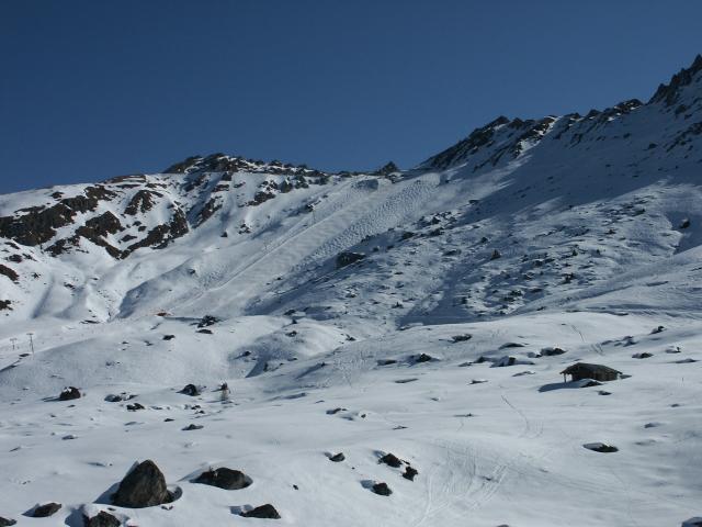 Der Bus bringt einen an den Sessellift "Les Masses", den man bei mir im demnächst veröffentlichten Teilgebiet Thyon findet, mit dem man problemlos zurück ins Skigebiet findet: Wenn man "Les Masses" gefahren ist, kann man direkt umsteigen in den nächsten Sessellift "Etherolla", von dem man dann direkt an den Tellerlift "Tsa" fahren kann. Prinzipiell verlässt man aber schon so ein bisschen das Skigebiet, wenn man sich für diese Fahrt entscheidet: Sie ist landschaftlich sehr schön, sehr lang, abgeschieden (mit allen Vor- und Nachteilen!) und unpräpariert - sicherlich nicht für Anfänger geeignet! Als ich sie das letzte Mal gefahren bin (vor einigen Jahren, danach gaben es die Verhältnisse als ich da war leider nicht wieder her) gab es im unteren Drittel eine kleine Hütte, in der man Getränke und eine Kleinigkeit zu Essen bekam - aber ich weiss nicht, ob es die heute noch gibt. Insofern sollte man also nicht nur für den Notfall sondern auch für Hunger und Durst ausgerüstet sein. |