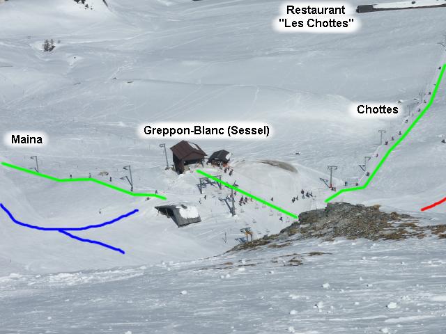An der Talstation des Greppon Blanc-Sessellifts endet neben dem Bügellift Chottes auch der Tellerlift Maina. Hierhin kommt man, wenn man von Siviez aus über Combatzeline und Greppon Blanc Rchtung Veysonnaz und Thyon fährt. Von hier aus kommt man weiter sowohl zum Übergang am Tellerlift Tsa Richtung Veysonnaz und Thyon als auch über einen Ziehweg Richtung Greppon Blanc-Tellerlift, mit dem man dann weiter Richtung Combatzeline und Siviez fahren kann.