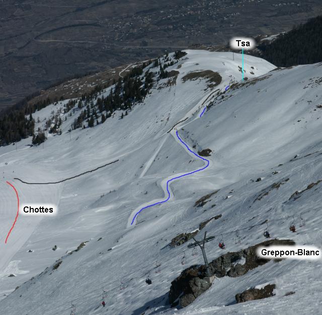 Der Verbindungsweg von Tsa hinunter zur Piste von Chottes ist die in der nebenstehenden Skizze schwarz eingezeichnete Linie. Es handelt sich um einen Weg, der kaum breiter ist als ein normaler Ziehweg, also relativ eng. Auf Grund der Steilheit und weil hier meist sehr viele Leute fahren, habe ich sie als schwarz klassifiziert. Wegen der Steilheit und der Masse an Leuten kommen hier auch schnell Steine heraus, was den Weg noch enger macht.