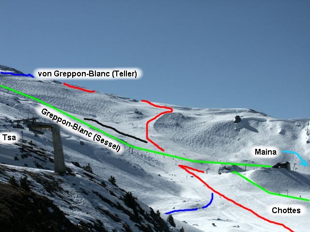 Hinweis: Diese Seiten sind in den Jahren 1998 bis 2005 entstanden, daher sind viele Informationen veraltet. Im Bereich Tracouet gibt es z.B. auf dem See keinen Lift mehr, der Prarion-Sessel ist durch einen Mix ersetzt, im Bereich von Siviez führt eine durchgehende Gondel nach Prarion, in Siviez selbst bibt es eine Brücke für Skifahrende über den Parkplatz, usw. Greppon-Blanc - Pisteninfo