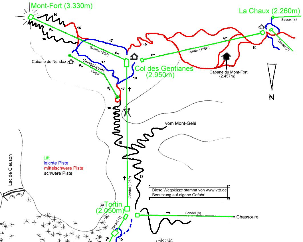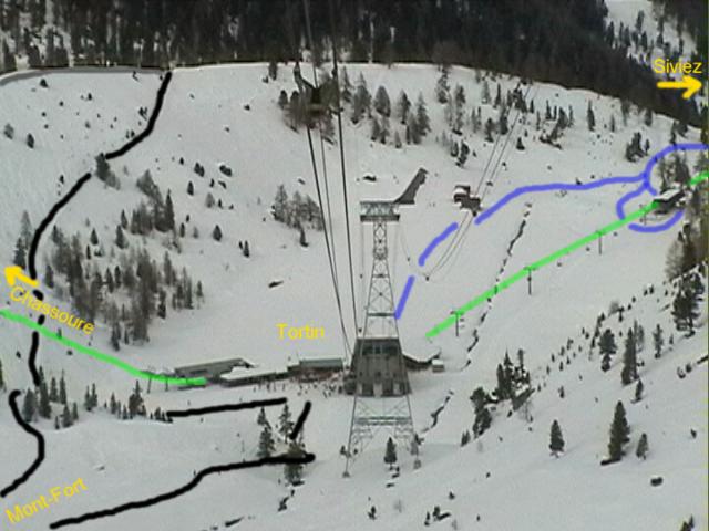 Hinweis: Diese Seiten sind in den Jahren 1998 bis 2005 entstanden, daher sind viele Informationen veraltet. Im Bereich Tracouet gibt es z.B. auf dem See keinen Lift mehr, der Prarion-Sessel ist durch einen Mix ersetzt, im Bereich von Siviez führt eine durchgehende Gondel nach Prarion, in Siviez selbst bibt es eine Brücke für Skifahrende über den Parkplatz, usw. Mont-Fort - Pisteninfo
